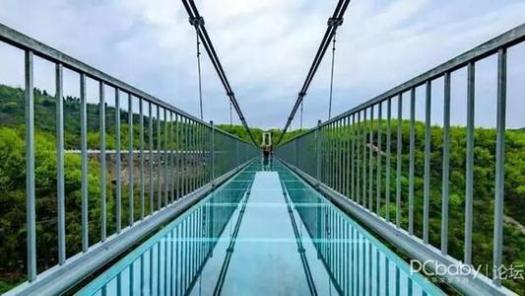 層樓高,集玻璃碎裂、吞云吐霧、玫瑰廊橋等20 余種絢麗特效,擁有聲光控為一體的7D特效裝置 形容的就是中國首家恐龍水晶玻璃橋——客天 下恐龍水晶玻璃橋。游客在橋上俯瞰遠望,四面風 景如畫,美景盡收眼底,一不小心觸碰到“神秘機關”,玻璃會瞬間“炸裂”,能體驗意想不到的緊